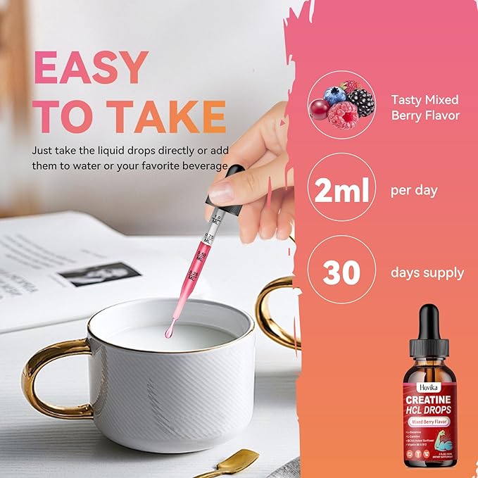 - DELICIOUS & EASY TO TAKE- The great tasting liquid creatine drops have a delicious fruity mixed berry flavor that everyone loves. It is easier to take and may have a faster and higher absorption rate comparing to gummies or pills. You may take 2 ml directly into mouth or add them in water or your favorite beverage. The creatine drops are soy free, non-GMO, gluten-free and vegan-friendly.*