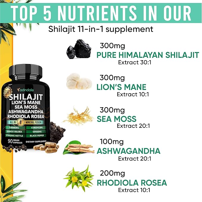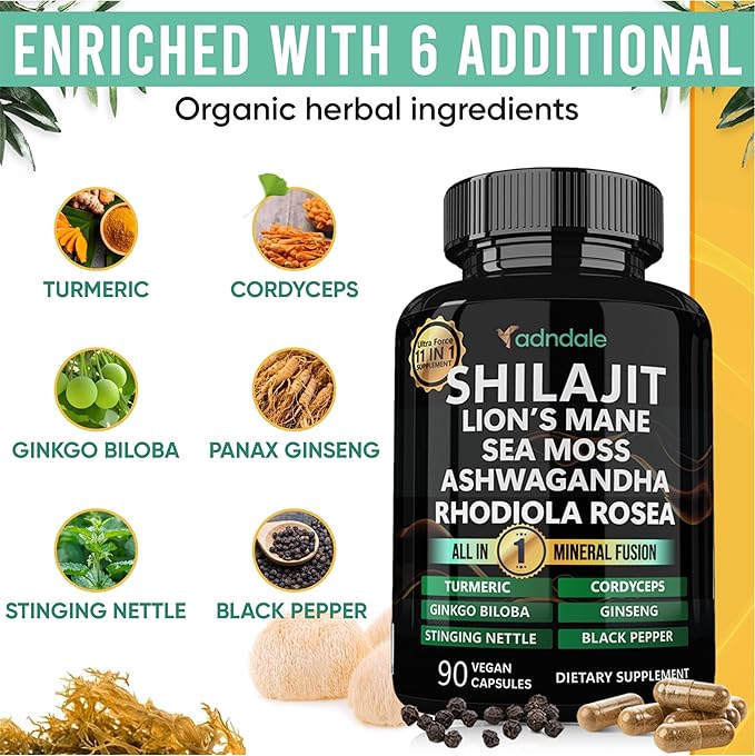 - FORMULA CONTENT: Adndale introduces a proprietary supplement formula of 11 natural ingredients including Himalayan Shilajit, Ashwagandha, Rhodiola, Panax Ginseng, Ginkgo Biloba, Lions Mane, Sea Moss, Black Pepper, Turmeric, Stinging Nettle, and Cordyceps in convenient capsule form