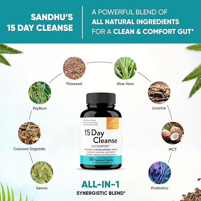 - SUPPORTS DIGESTIVE HEALTH: Sandhu's 15 Day Gut Cleanse supports healthy and regular bowel movement thereby assisting in cleansing of wastes from your body. Our 15 day colon cleanse is formulated with natural ingredients to support your body's natural detoxification process