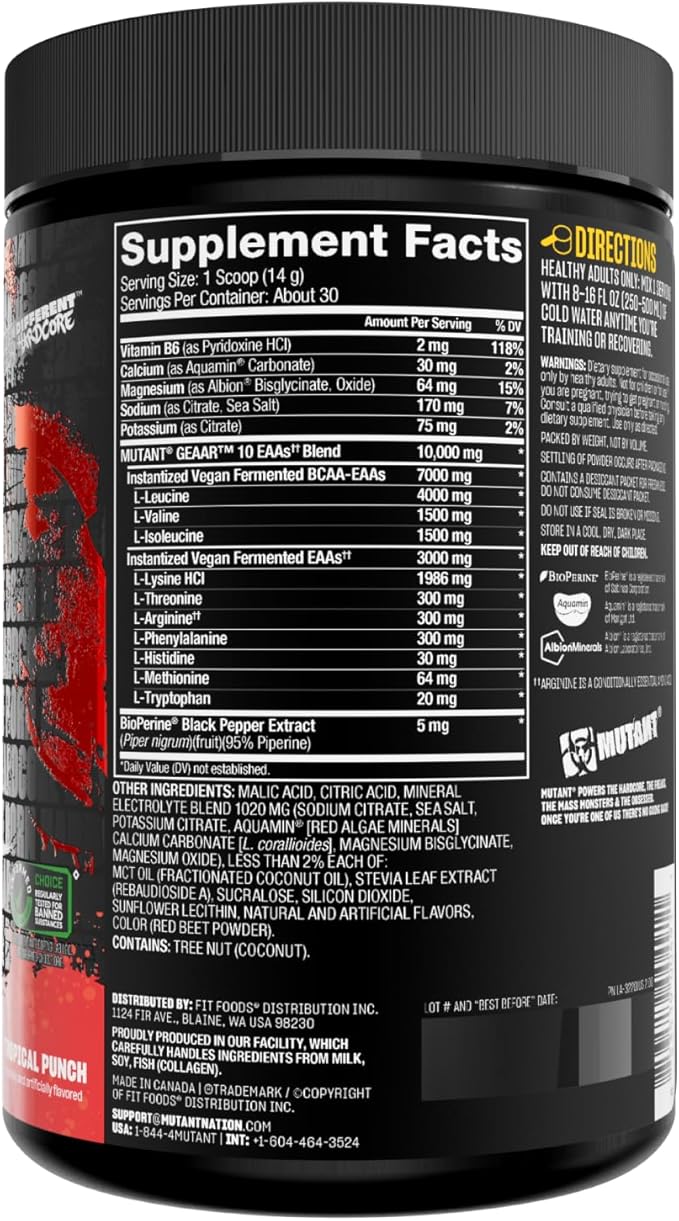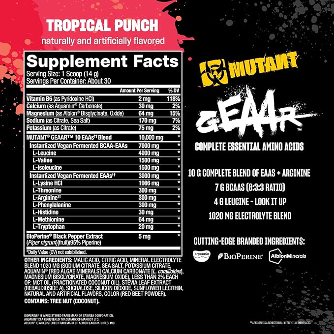 Mutant GEAAR - 9.4g of EAA Powder + Arginine, 7g BCAAs, 4g Leucine, Electrolytes, Coconut Water, 30 Servings - Fruit Punch