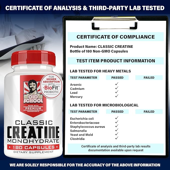 Old School Labs 5000mg Creatine Monohydrate Capsules With BioFit™ (Max Strength) Supports Muscle Growth & Recovery, Performance, Cognitive Health - Creatine Pills for Men & Women, Made in USA 180 Caps