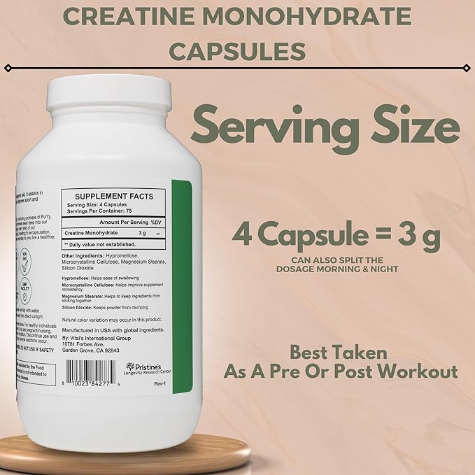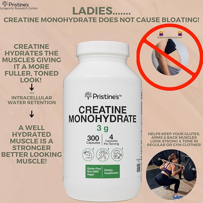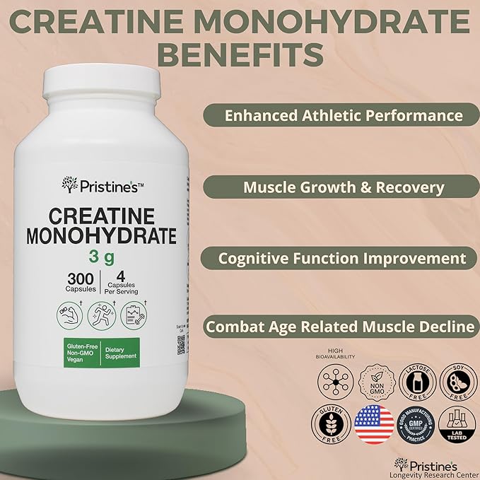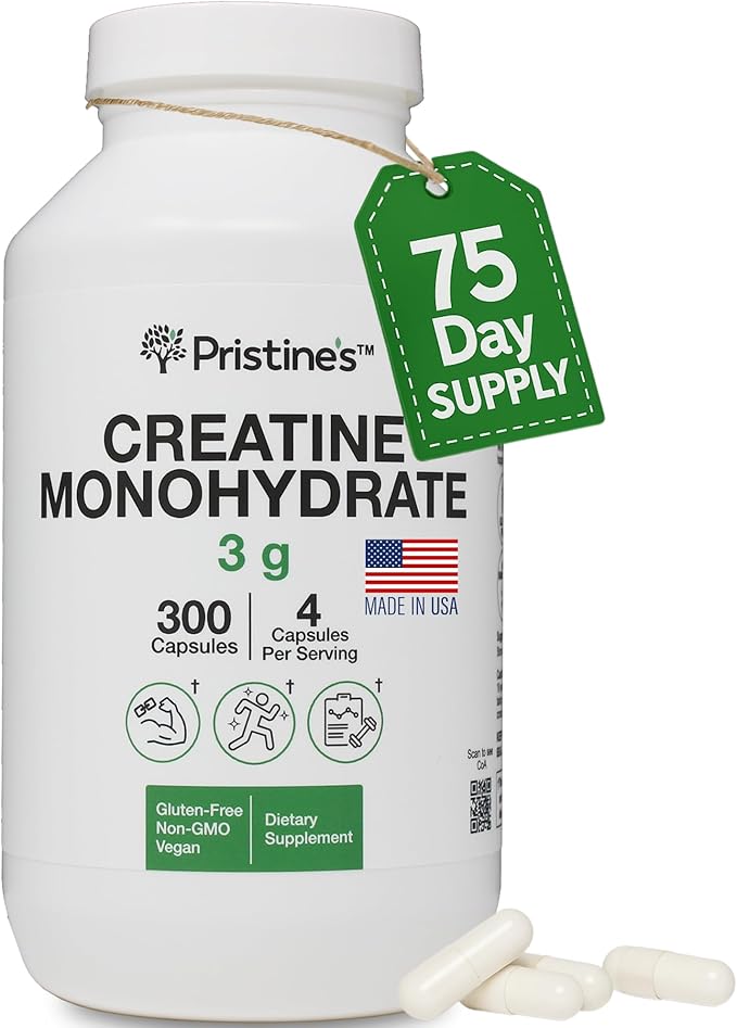 PRISTINE'S Creatine Monohydrate Capsules for Women & Men - No Bloat 75 Day Supply 3G Muscle Growth Support Supplement - Cognitive & Athletic Performance Support - Enhanced Recovery