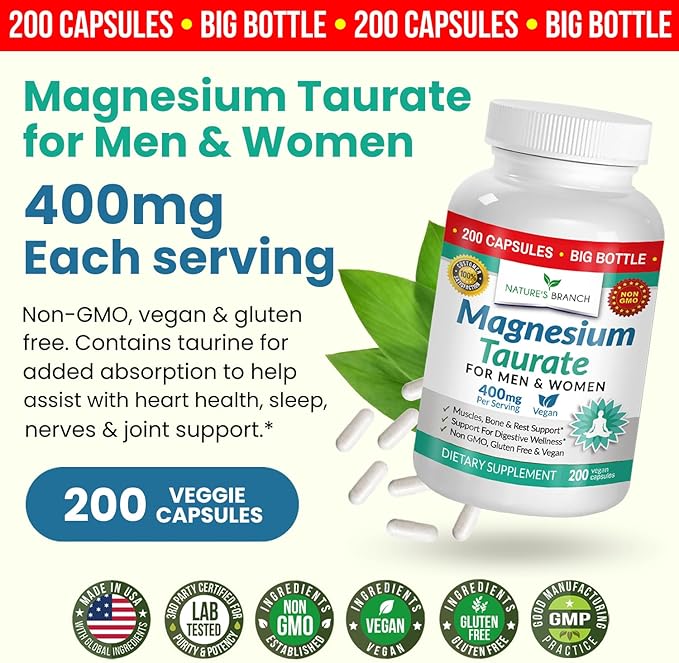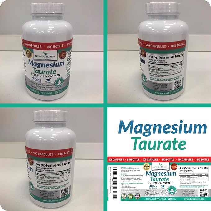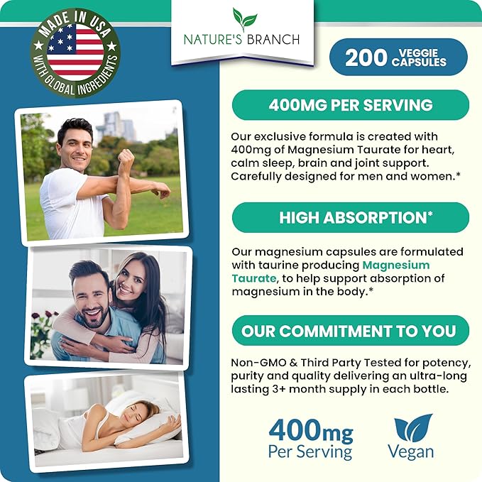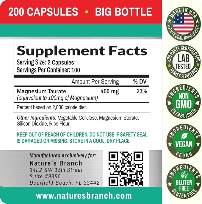 - MADE IN THE USA & THIRD PARTY TESTED: Nature’s Branch Magnesium Taurate supplement contains elemental magnesium plus taurine, globally sourced, to support bio availability – Tested and safely sealed for quality, potency and purity. Our magnesium unflavored, vegetarian capsules are free from artificial flavors and sweeteners, providing a pure non-GMO and gluten free choice