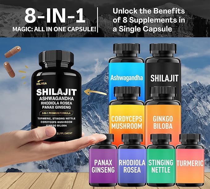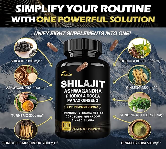 - 💪TRANQUIL NIGHTS & VIBRANT MORNINGS: Discover the secret to wakeful mornings & restorative sleep with DLNIA all-in-one supplement shilajit pure Himalayan organic capsules; The blend of Turmeric, Cordyceps Mushroom, Stinging Nettle with Himalaya Shilajit for women & men boost energy, improve immunity ; A single solution to all your supplement needs
