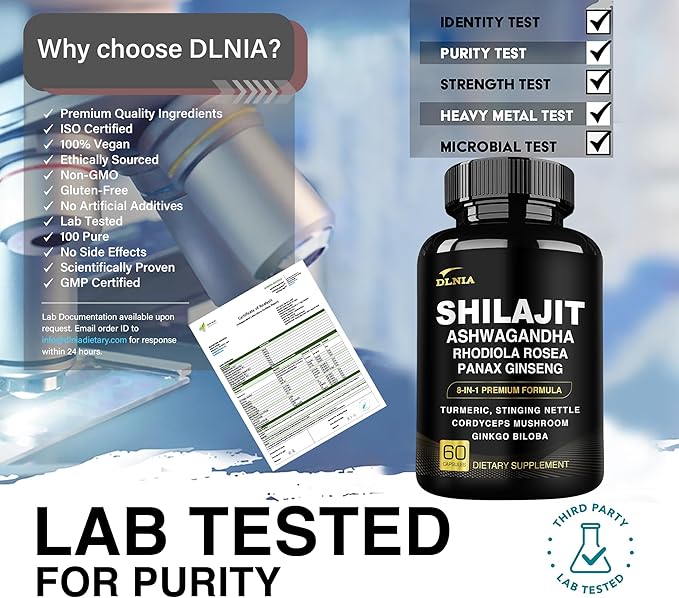 - 💪SATISFACTION GUARANTEE WITH EVERY CAPSULE: Harvested from the ancient Himalayas & meticulously blended with 7 potent, natural ingredients, our DLNIA 8-in-1 Shilajit Supplement is proudly formulated, tested, & certified here in the USA; we hold our product to the highest standards of quality, & efficacy; Your Health & satisfaction are our priorities, so rest assured that our shilajit premium capsules are free from impurities & preservatives