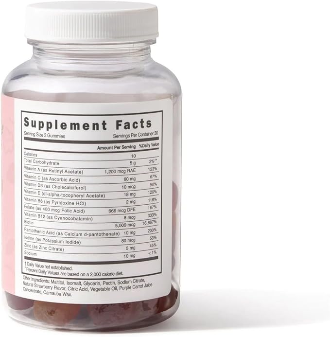 - COMPLETE WOMEN’S DAILY NUTRITION – Delivers essential vitamins A, C, D3, E, B6, B12, folate, biotin, iodine, and zinc in one tasty gummy.