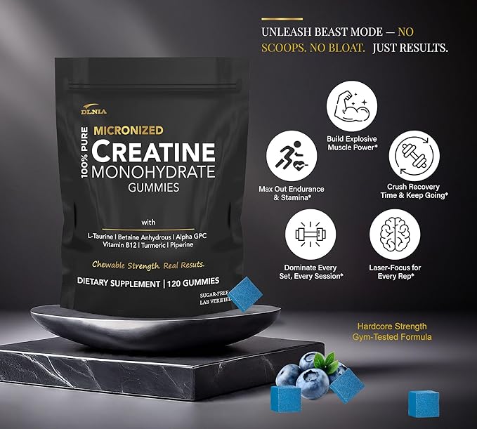 - SUPERCHARGE MUSCLES GAME ANYTIME, ANYWHERE: Whether you're hitting the gym, conquering a hike, or tackling daily tasks at the office, DLNIA creatine gummies are your pocket-sized go-to natural supplement, formulated to boost your stamina & increase your muscle mass. No measuring, no mixing, just pure, & convenient creatine power in each gummy.