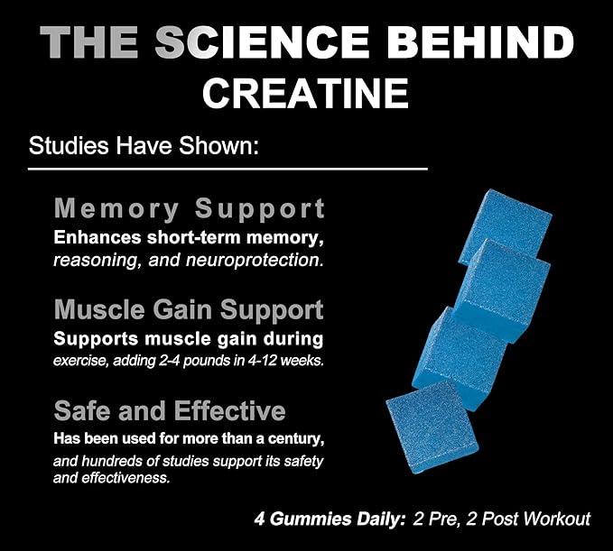- FUEL YOUR WORKOUTS, SMASH YOUR GOALS: Enjoy a pre-workout energy burst & post-workout replenishment, all in one delicious creatine gummy. Optimize your performance with every bite, helping you bounce back stronger & ready to tackle any challenge. Each gummy delivers a powerful blend of nutrients to support your fitness goals & help you achieve your best.