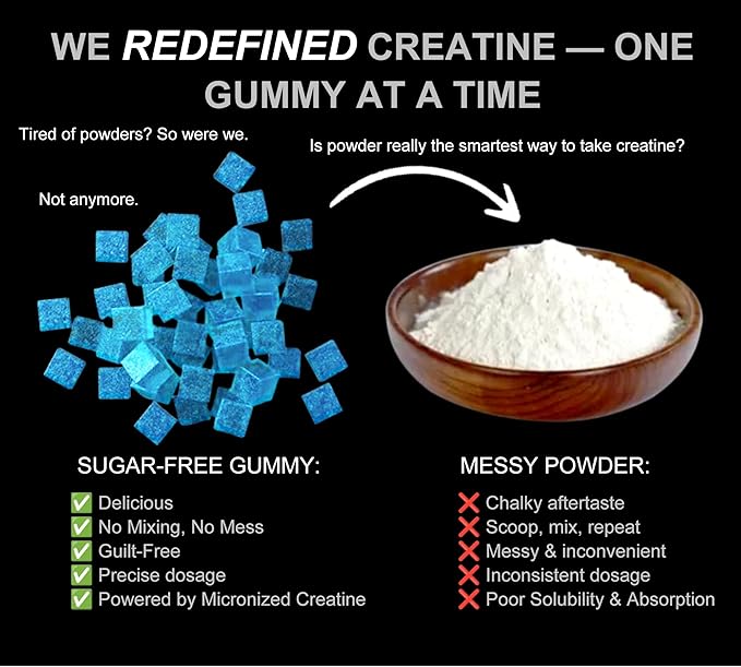 - DITCH THE SCOOPS & INCONVENIENT SHAKES: Say goodbye to the messy powders & creatine pills & enjoy powerful creatine in tasty, sugar-free Blueberry gummies. It's the convenient, delicious way to fuel your workouts & get rid of bloating or stomach discomfort. Our gummies offer a delightful, easy chew that won't stick to teeth. With 120 creatine gummies, you’ve got the supply for 30 days. Take 4 gummies a day to keep your muscle fatigue away.