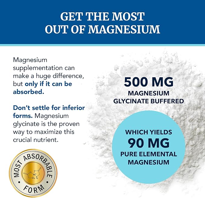 - HIGH ABSORPTION MAGNESIUM: Magnesium glycinate (magnesium bisglycinate) is the most bioavailable form. 500mg of chelated magnesium glycinate delivers 90mg of elemental magnesium in its most bioavailable form.*