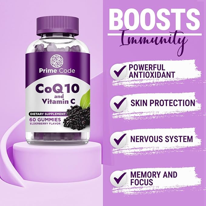 Prime Code CoQ10 200mg & Vitamin C 250mg Gummies – Antioxidant & Immune Support – Heart & Energy Supplement for Adults – Vegan, Non-GMO, Gluten-Free – Elderberry Flavor – 60 Gummies