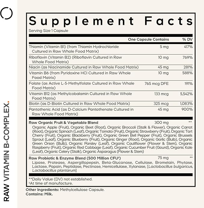 - This vitamin B supplement in capsules formula is further enriched with a raw organic fruit & vegetable blend, featuring a diverse array of nutrient-dense ingredients such as apple, beet, blackberry, broccoli, carrot, spinach, strawberry, tart cherry, tomato, and more, providing an additional source of vitamins and minerals to complement the B-complex.