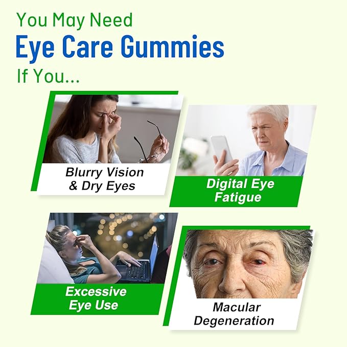 - [ 8-IN-1 Eye Health Gummies ] Our gummy is loaded with key ingredients acknowledged for promoting eye health, including lutein, zeaxanthin, bilberry, goji berry, astaxanthin, and vitamins A, C, E.