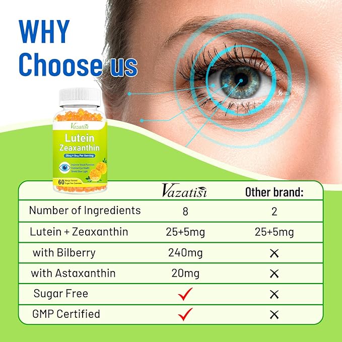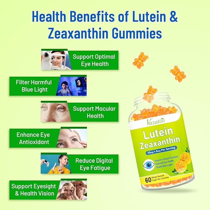 - [ Lutein and Zeaxanthin Gummies ] Lutein and zeaxanthin are powerful antioxidants that promote eye health, 2 Gummies a day you will get 25mg lutein, 5mg zeaxanthin, bilberry, and more, which play a key role in healthy vision.
