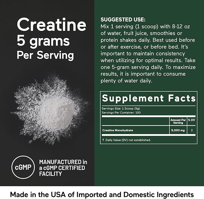 - 3rd PARTY TESTED, PREMIUM QUALITY: Smarter Nutrition Creatine Monohydrate Powder contains 5 grams (5000 mg) of quality creatine monohydrate per scoop and is manufactured in the USA of domestic and/or imported ingredients in a cGMP-certified facility with third-party quality control audits