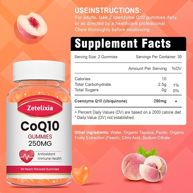 - Yummy Peach Flavor: This CoQ10 gummy is water-soluble, without a sticky texture, and is easier to digest and absorb nutrients by your body. The Peach flavor without lingering aftertaste makes the CoQ10 gummy an enjoyable part of your daily routine of health, enhancing absorption of the fat-soluble vitamin CoQ10