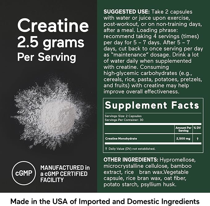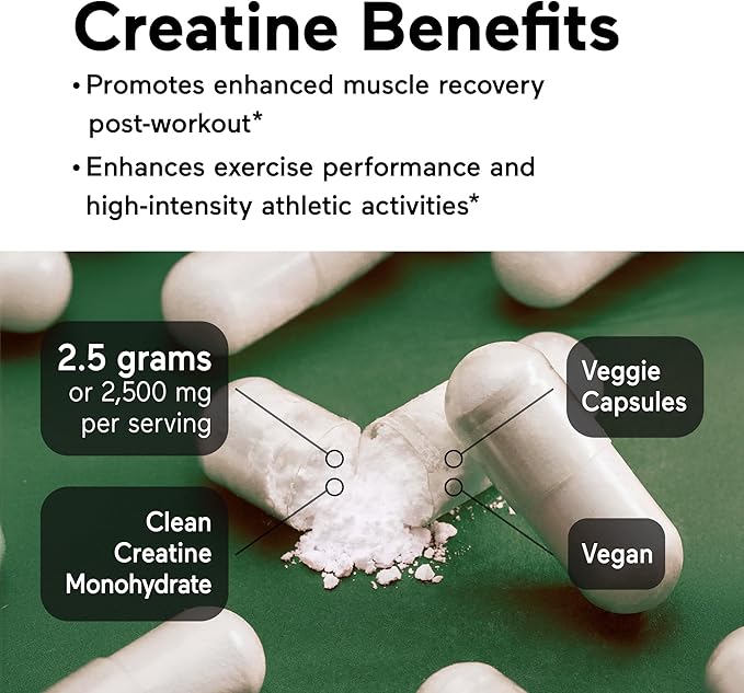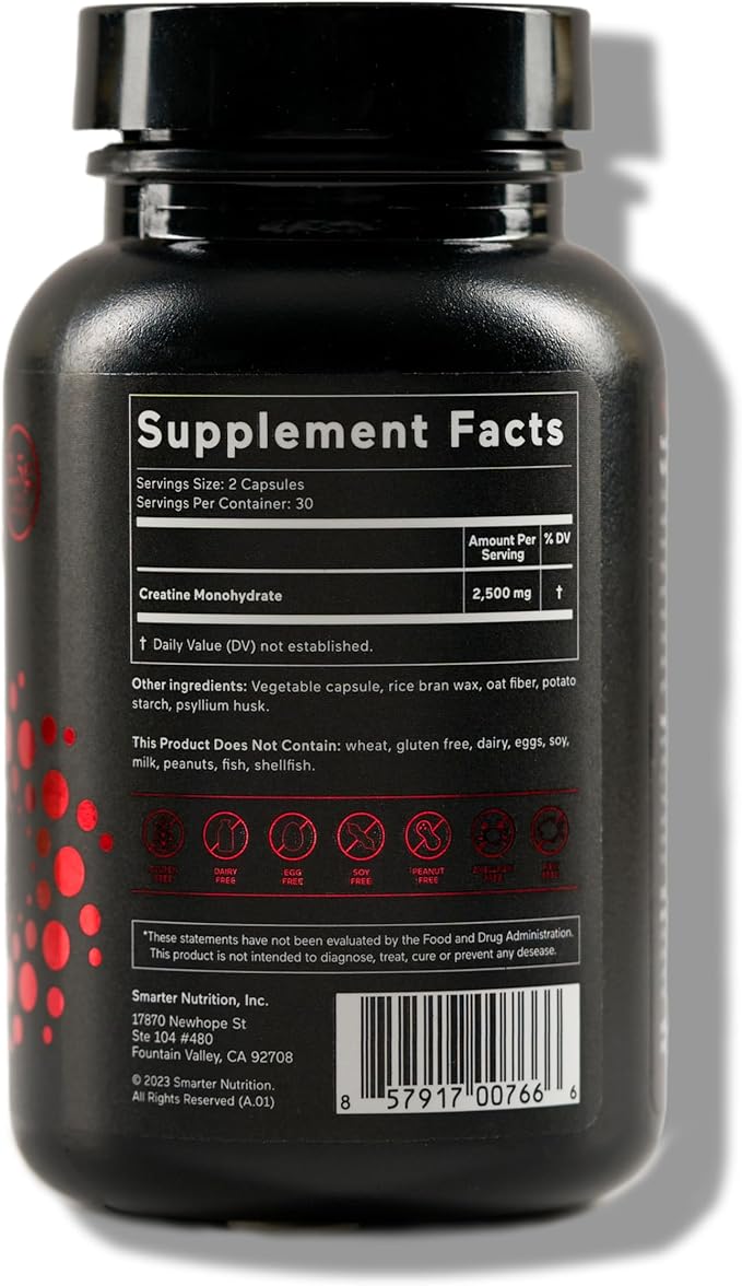 SMARTERNUTRITION Creatine Monohydrate Pills with 2500mg (2.5g) Per Serving, Vegan Capsules - Pre & Post Workout Recovery Support, Promotes Muscle Mass &. Endurance - 60 Count[30-Day Supply]