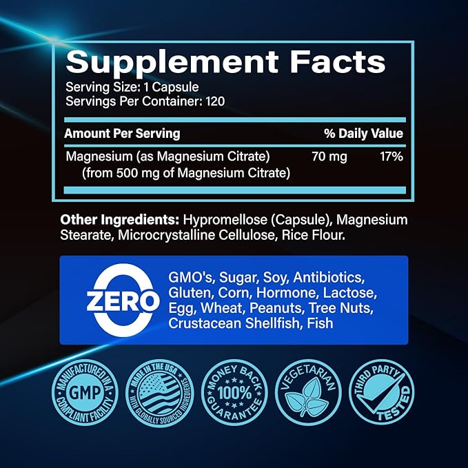- 120 Capsules for 4 Months Supply: Empower yourself to effortlessly reach your wellness goals with confidence and ease! With a supply of 120 concentrated capsules per bottle, you'll have access to an abundance of high-potency magnesium citrate. Unlock the ultimate supplement solution with our magnesium citrate, renowned as the most soluble and bioavailable form of magnesium!