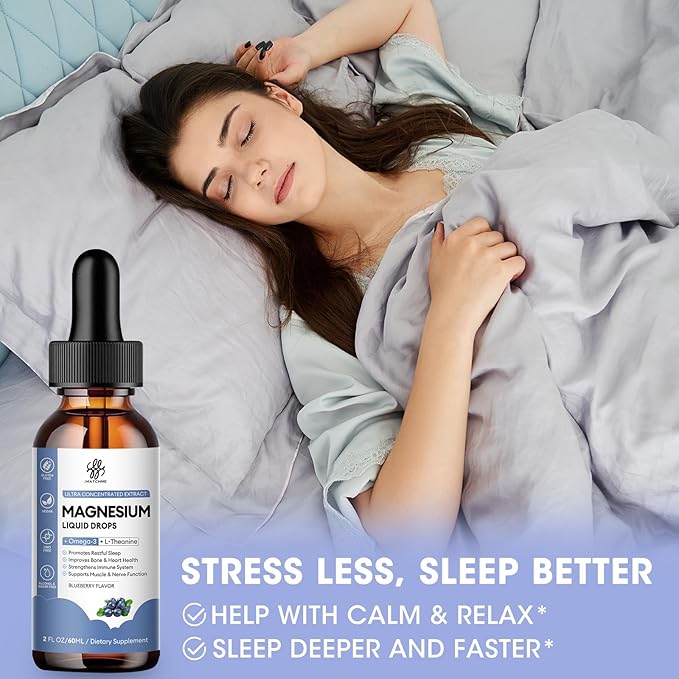 Magnesium Glycinate Liquid, Magnesium Complex Supplement with Omega3, L-Theanine and Vitamin for Calm, Sleep Support, Muscle Relief, Non GMO, Blueberry Flavor, 2 Fl Oz