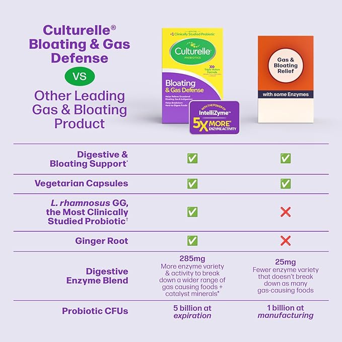 - TRIPLE-ACTION RELIEF: Culturelle Bloating and Gas Defense is a probiotic and fast-acting digestive enzyme supplement with a unique triple-action formula. It naturally works with your body to safely reduce occasional bloating, gas and indigestion.