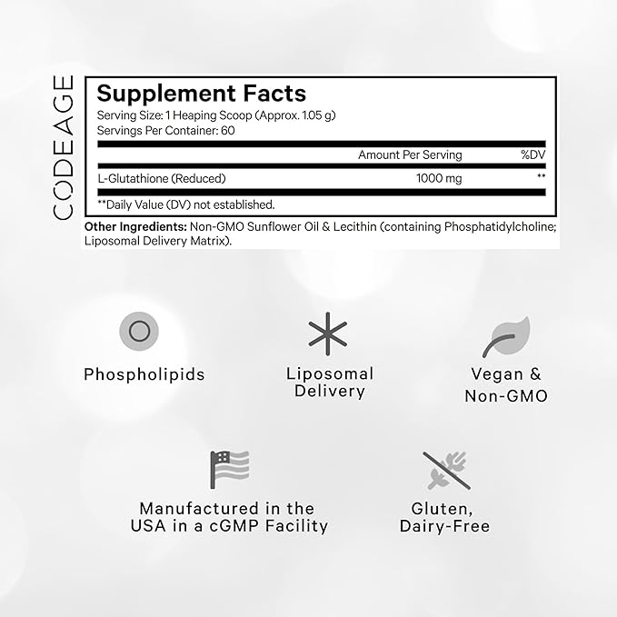 - High-Potency Glutathione: Codeage Liposomal Glutathione powder supplement delivers 1,000 mg of reduced L-Glutathione per serving, providing a substantial amount of this key compound in each scoop.
