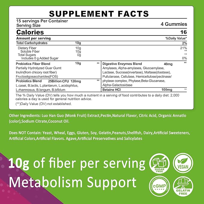 - 【Advanced Formula, Maximum Efficacy】Nature fiber gummies for adults providing 10g of fiber per serving along with 25 Billion CFU probiotics blend, 40mg digestive enzymes and 100mg betaine HCl to promote overall health and boost Immune system. In addition, prebiotic feed probiotic, the good bacteria in your gut. Digestive enzymes help break down complex carbohydrates and betaine supports the body process metabolism. 4 in 1 fiber gummies shelf-stable and no refrigeration needed!