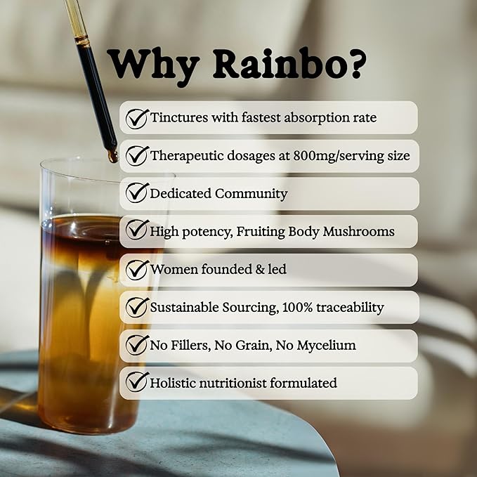 - SUSTAINABLY CULTIVATED MUSHROOMS from Canada. Rainbo organic mushrooms are filtered through non GMO pure ethyl alcohol and hot water, extracting the bioactive compounds to form a fast absorbing liquid tincture. Our tinctures are pure, vegan, and only contain fruiting body mushrooms.