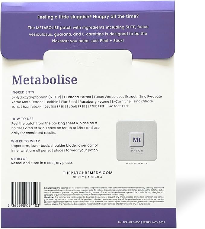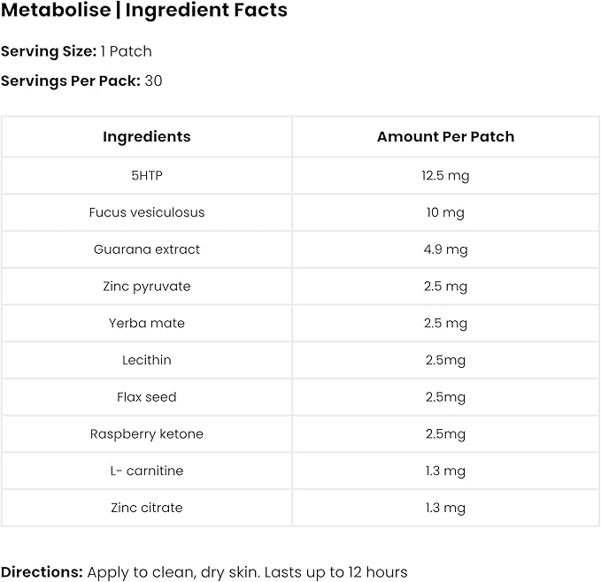 Metabolise Patch | 5-HTP, Guarana, L-Carnitine, Fucus, Zinc, Yerba Mate, Raspberry Ketone | 30 Patches