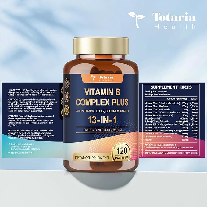 - VITAMIN B COMPLEX PLUS: Totaria 13-in-1 Vitamin B Complex, containing Vitamin B1, Vitamin B2 (Riboflavin), Vitamin B3 (Niacinamide), Vitamin B4 (Choline), Vitamin B5, Vitamin B6, Vitamin B7 (Biotin), Vitamin B8 (Inositol), Vitamin B9 (Folate), Vitamin B12, Vitamin C, Vitamin D3, Vitamin K2. Super B complex, 13 kinds of vitamins to satisfy your 13 kinds of nutritional supplements.