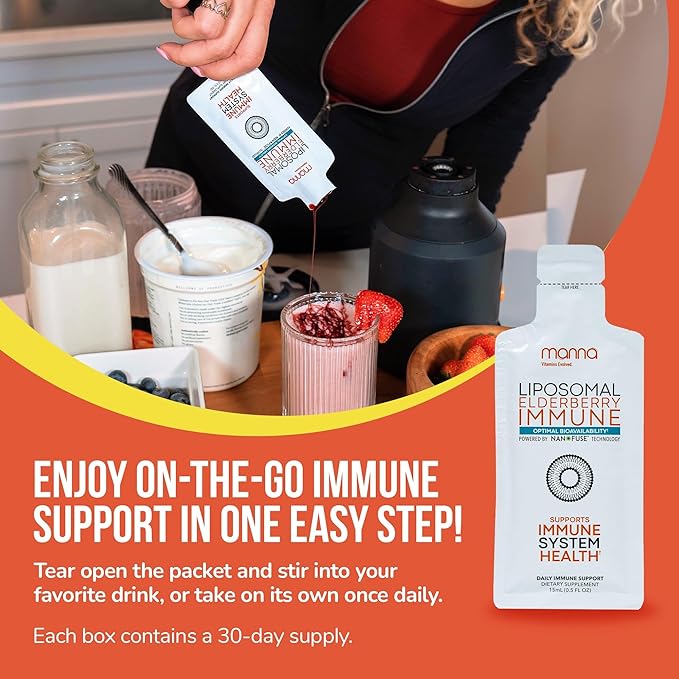 Manna Vitamins Evolved Liposomal Elderberry Immune Packets – Vitamins C, D, Zinc etc. - Daily Immune Support for Adults, Kids - Sugar Free, Real Elderberry Extract, Syrup, Travel-Friendly, 30 Pack