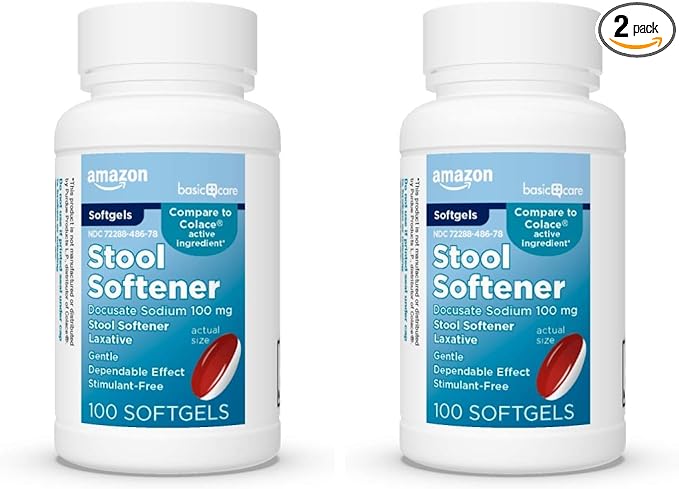 Amazon Basic Care Stool Softener Laxative, Docusate Sodium 100 mg, Softgels, for Constipation Relief, 100 Count (Pack of 2)