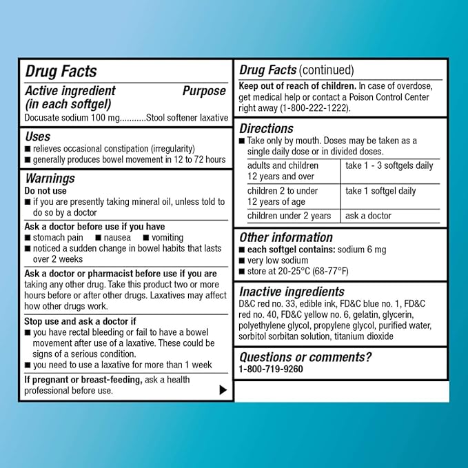 - STOOL SOFTENER LAXATIVE, Amazon Basic Care Docusate Sodium 100 mg, Softgels contain docusate sodium 100 mg, the physician recommended stool softener OTC active ingredient (of U.S. physicians surveyed by an independent market research firm). Compare to the active ingredient in Colace