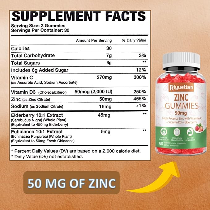 - 3 - IN - 1 ZINC GUMMIES: Riyuetian Zinc gummies are enriched with Zinc, Vitamin C, and Elderberry Extract. 2 gummies a day will offer an optimum dose, supports immune response and helps support numerous bodily functions.