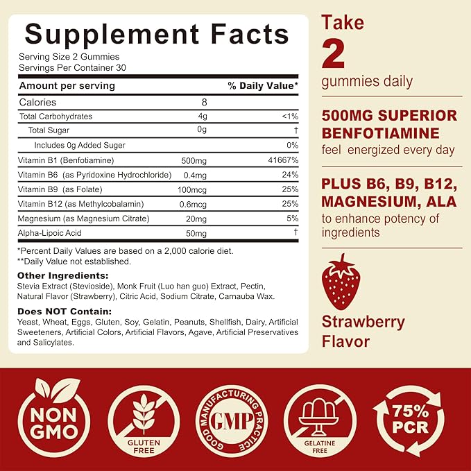 - 500mg of Benfotiamine, paired with Vitamin B6 and Magnesium Citrate