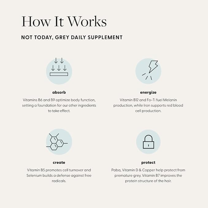 - SLOW GREY HAIR IN 3-6 MONTHS: Not Today, Grey helps with hair repigmentation, delivering a powerful blend of vitamins, minerals, and antioxidants to slow down the progression of grey hair.