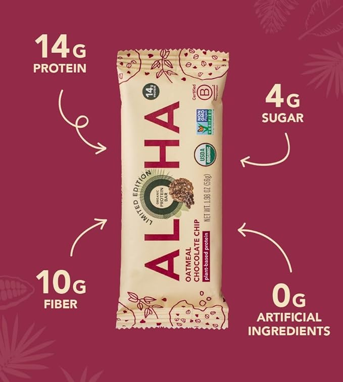 ALOHA Organic Plant Based Protein Bars - Oatmeal Chocolate Chip - 12 Count, 1.9oz Bars - Vegan Snacks, Low Sugar, Gluten-Free, Low Carb, Paleo, Non-GMO, Stevia-Free, No Sugar Alcohols