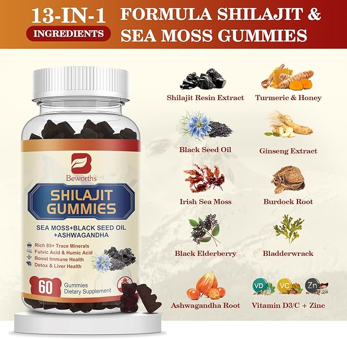 - 【13-In-1 FORMULA OF SHILAJIT SEA MOSS and ASHWAGANDHA COMBO】- Our high-quality and effective shilajit gummies for men are made from natural ingredients, containing 10000mg of pure Shilajit resin. Loaded with a potent blend of Shilajit Resin, irish sea moss, black seed oil, ashwagandha ginger, Panax Ginseng, Turmeric, Elderberry, Honey, Burdock, Bladderwrack, vitamin C, D3 and zinc, and a variety of other herbal extracts, the 13-in-1 formula offers an abundance of benefits. The perfect Sea Moss and Black Seed Oil is known for immune support and the combination formula Shilajit from potential energy enhancement to overall wellness.