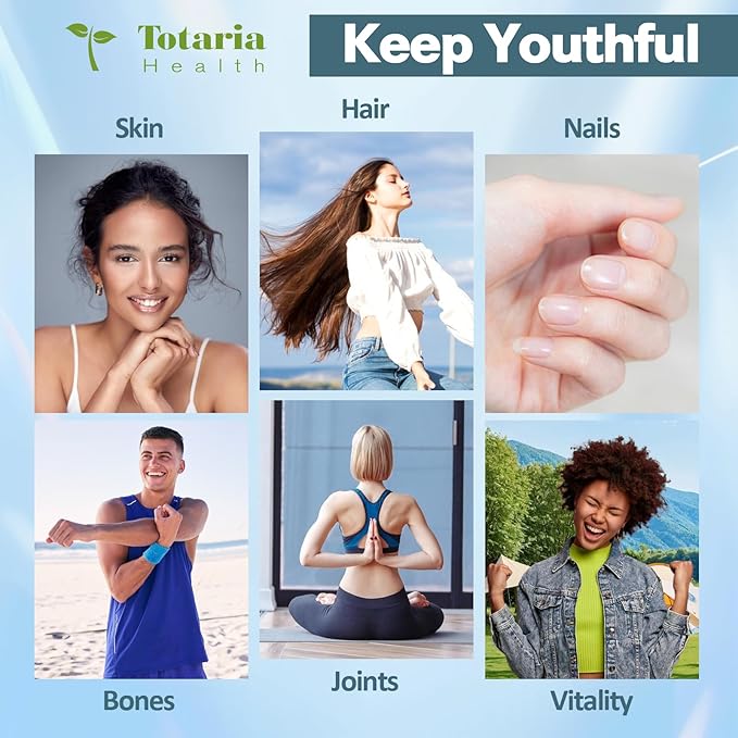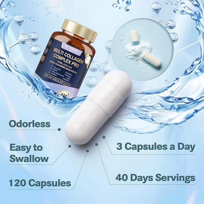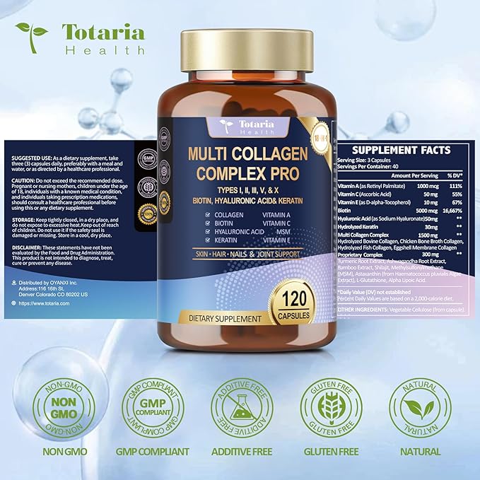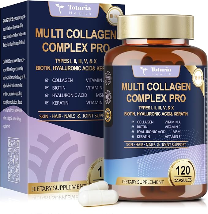 - MULTI COLLAGEN COMPLEX PRO: Hydrolyzed Bovine Collagen, Chicken Bone Broth Collagen, Hydrolyzed Fish Collagen, Eggshell Membrane Collagen cantain multi collagen peptides - Collagen Type I II III V & X . The perfect blend of 18 premium ingredients. Premium collagen supplements for women & men. Totaria glow beauty collagen pills, revealing your skin radiance, youthfulness and vitality easily.