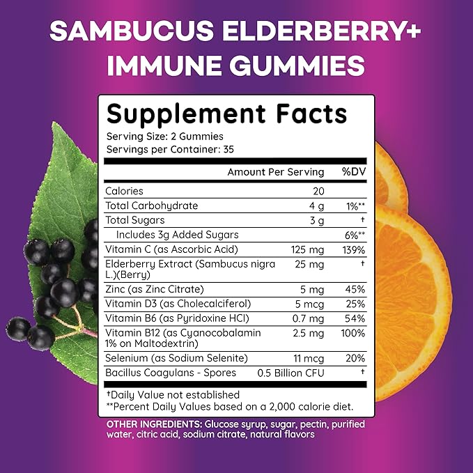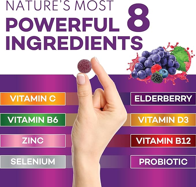 - Delicious and Convenient: Enjoy the delightful raspberry flavor of our Elderberry gummies while benefiting from the antioxidant-rich elderberry extract, vitamin C, vitamin B6, vitamin B12, vitamin D3, zinc, selenium, and probiotics, providing daily immune support in a tasty and easy-to-take form.