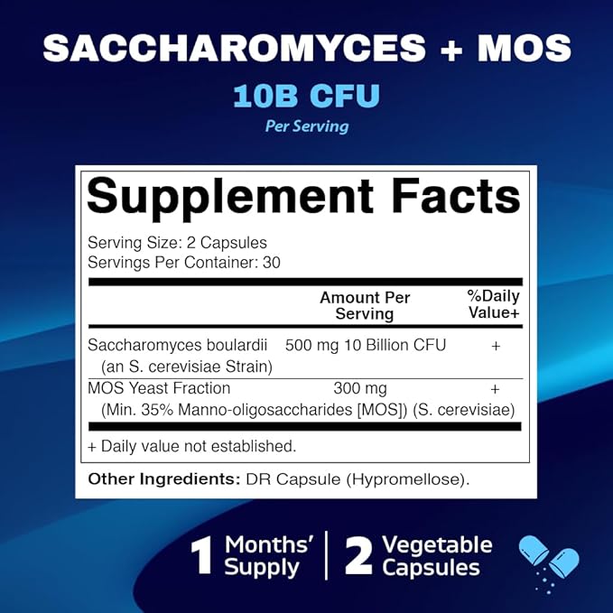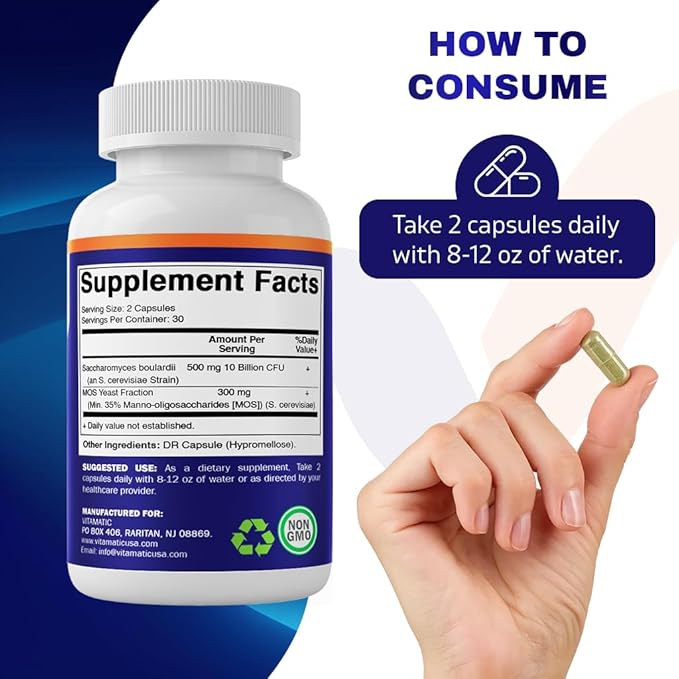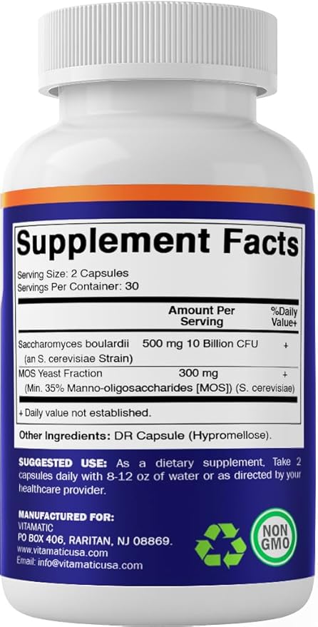 Vitamatic Saccharomyces Boulardii Probiotic 10B per Serving + Yeast Extract (MOS Yeast Fraction) 300 mg - 60 DR Capsules - Made in The USA