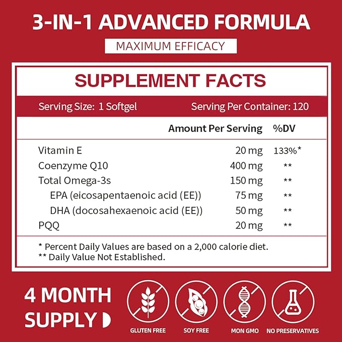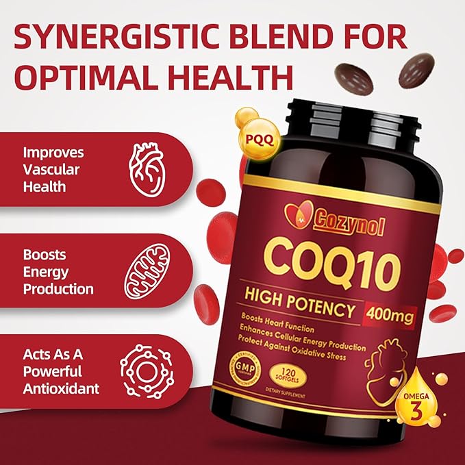 - POTENT AND SYNERGISTIC SUPPLEMENT: Get 400 mg of Coenzyme Q10 (CoQ10) per serving, a potent antioxidant combined with Omega-3 fatty acids, Vitamin E, and PQQ, forming a synergistic blend. From heart support to cellular energy production and antioxidant defense, our CoQ10 softgels provide a comprehensive approach to health, perfect for those seeking an all-in-one supplement for overall well-being.