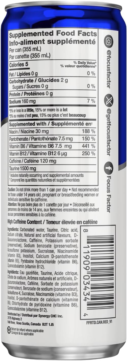 Focus Factor Energy Drink - 12 x 355ml Cans (Fruit Punch Flavour) - with Focus + Energy - Lightly Carbonated, Sugar Free, Low Calorie with Vitamin B6 & Vitamin B12