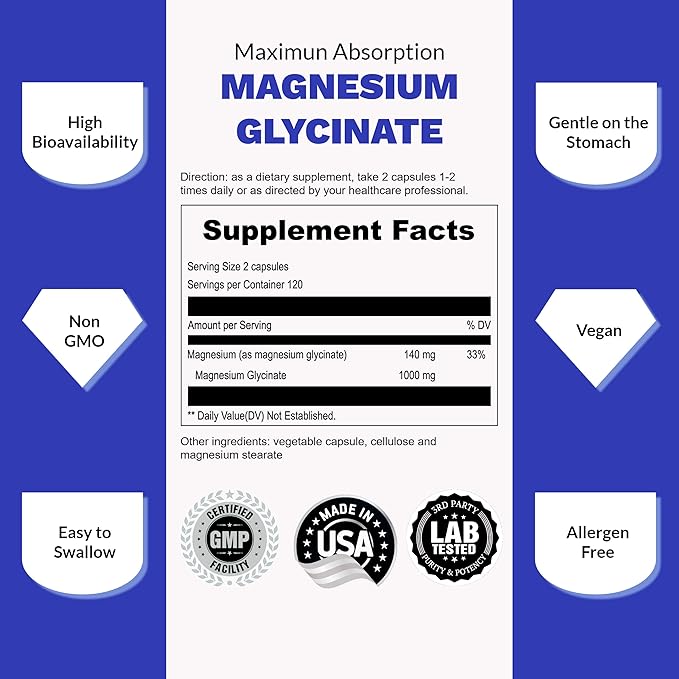 - GUT-FRIENDLY: Say goodbye to digestive problems! Our Magnesium Glycinate supplement provides a soothing experience without causing discomfort. It unleashes the natural calming effects of magnesium, making it a great choice for daily use.