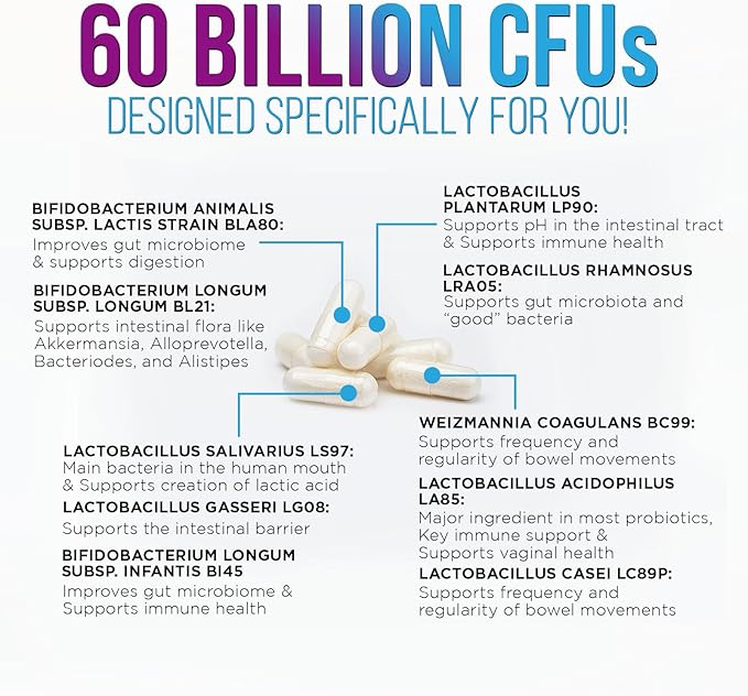 - Advanced Digestive Support with 60 Billion CFU: Probiotics for women and men delivering 60 billion CFU from 10 diverse strains, including Lactobacillus, to support gut flora and overall digestive health