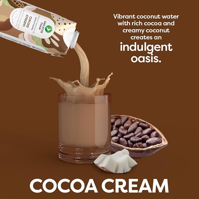 - COCOA CREAM, READY WHEN YOU ARE: Whether it’s a packed lunchbox, gym bag, soccer practice, after-school pick-up, a weekend hike, or a road trip, GREATER THAN is hydration that moves with you. The velvety, dairy-free cocoa cream flavor offers a rich, chocolatey sip made with real cocoa powder and organic coconut water—great for fueling busy days and active families.