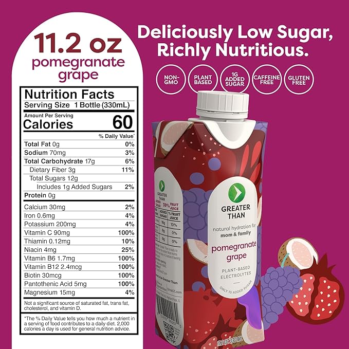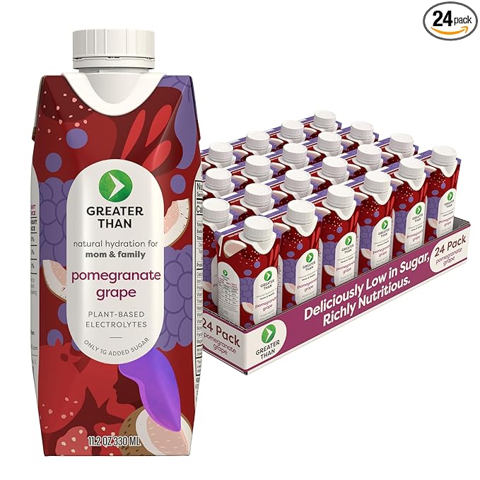 Greater Than Nutrient Hydration Beverage, Electrolyte Drink for Gut Health & Energy with Coconut Water, Vitamins, Gluten Free, Plant Based, Low Sugar, Pomegranate Grape, 24 Pack