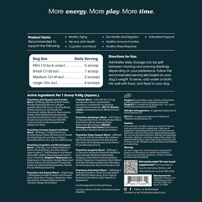 - Premium, Natural Ingredients: Made with 63 powerful ingredients for maximum anti-aging benefits, Arterra’s formula is developed by veterinarians and backed by science to ensure the highest quality and efficacy. Our product delivers more comprehensive health support than others on the market, significantly outperforming competitors in both ingredient quality and dosage. Made in the U.S.A., 100% filler-free, and backed by our Results Guarantee, Arterra is the superior choice for your dog’s health needs.
