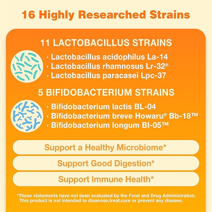 - 16 Strains Offers Broad-Spectrum Support: Our Probiotic contains a blend of 16 different lactobacillus and bifidobacteria strains offering support for gut health, each chosen for its unique ability to support digestive health and immune system*
