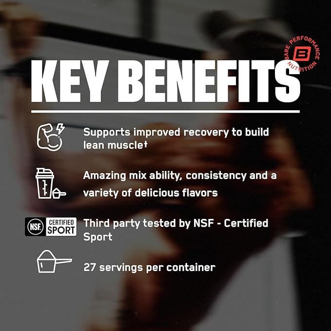 - PRIMARY BENEFITS: Supports improved recovery and muscle protein synthesis necessary to build lean muscle. Amazing mixability, consistency and a variety of delicious flavors. Mix 1 serving (1 scoop) in 6-8 oz of cold water, milk or milk substitute
