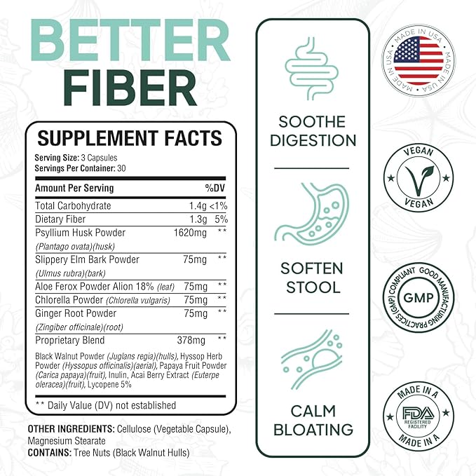 Better Fiber - Daily Fiber Supplement - Soften Stool for Effortless Bowel Movements - with Psyllium Hulk and Slippery Elm - 90 Capsules
